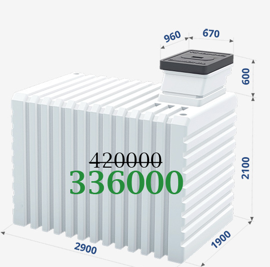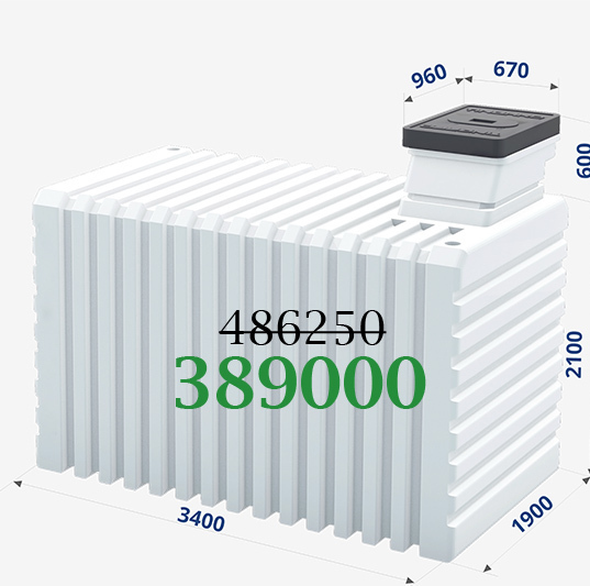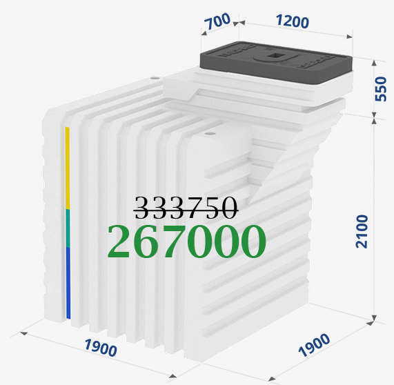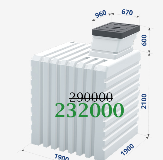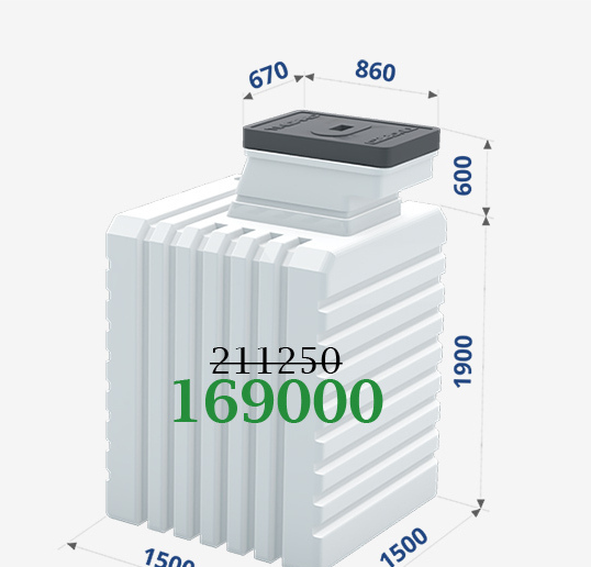 | Длина: 1,5 метра Ширина: 1,5 метра Высота: 2,5 метра Вход: 0,86 х 0,67 метра Объём: 4200 литров Вес: 410 килограмм Срок службы: >100 лет |
