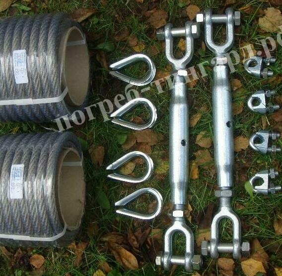 Трос: 2 штуки Талреп: 2 штуки Коуш: 4 штуки Зажим: 8 штук Гайка: 16 штук Инструкция: 1 штука Упаковка: 1 штука |